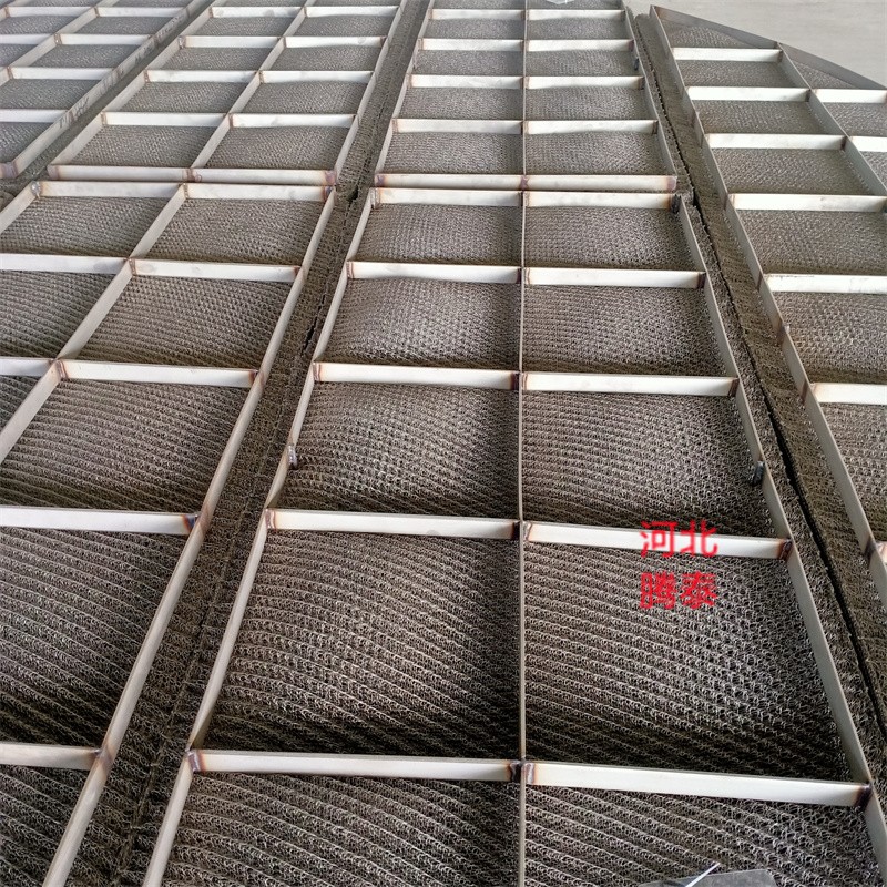 絲網(wǎng)除沫器主要是由絲網(wǎng)、絲網(wǎng)格柵組成絲網(wǎng)塊和固定絲網(wǎng)塊的支承裝置構(gòu)成,絲網(wǎng)為各種材質(zhì)的氣液過濾網(wǎng),氣液過濾網(wǎng)是由金屬絲或非金屬絲組成。氣液過濾網(wǎng)的非金屬絲由多股非金屬纖維捻制而成,亦可為單股非金屬絲。該絲網(wǎng)除沫器不但能濾除懸浮于氣流中的較大液沫,而且能濾除較小和微小液沫,廣泛應(yīng)用于化工、石油、塔器制造、壓力容器等行業(yè)中的氣液分離裝置中。