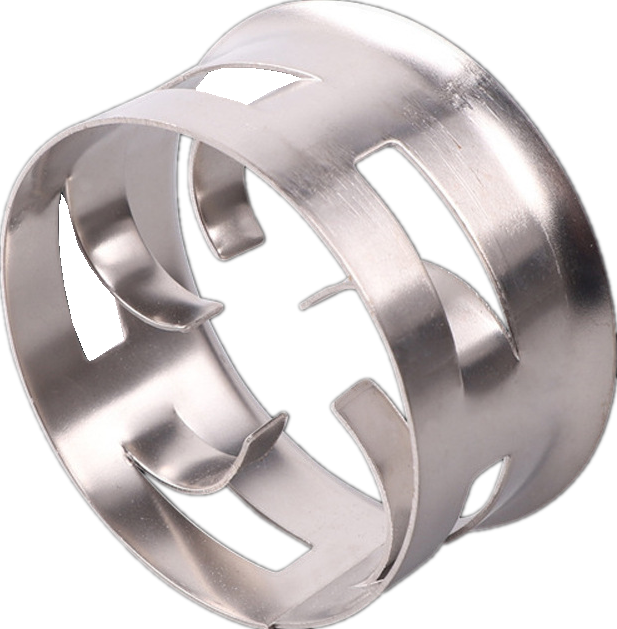 階梯環(huán)填料是七十年代初由英國傳質(zhì)公司應(yīng)用價值分析技術(shù)開發(fā)的一種新型開孔填料。階梯環(huán)(CMR)的高約為直徑的一半,環(huán)的一邊有錐形翻邊,環(huán)壁上開有窗孔,并有彎曲葉片伸向環(huán)心。由于高度減小及錐形翻邊的特殊結(jié)構(gòu),不但改善了填料層內(nèi)氣液分布,而且增加氣液接觸點,有利于液體匯聚分散及液膜表面的不斷更新,使傳質(zhì)得到強化,分離效率大大提高。一般階梯環(huán)填料較鮑爾環(huán)填料的通量提高10-20%,壓力降低30-40%,分離效率視具體工藝均有不同程度的提高。
