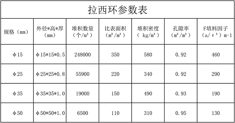 拉西環(huán)(Rasching ring)是工業(yè)上最早使用的一種人造填料。通常用陶瓷或金屬片做成,其高度與直徑相等,常用的尺寸為25mm~75mm(亦有小至6mm,大至150mm的)。陶瓷壁厚為2.5mm~9.5mm,金屬環(huán)為0.8mm~1.6mm,在強(qiáng)度許可的情況下,環(huán)的壁應(yīng)盡量減薄。拉西環(huán)雖然傳質(zhì)性能不理想,但由于結(jié)構(gòu)簡(jiǎn)單,制造容易,價(jià)格較低,仍為一些工廠采用。